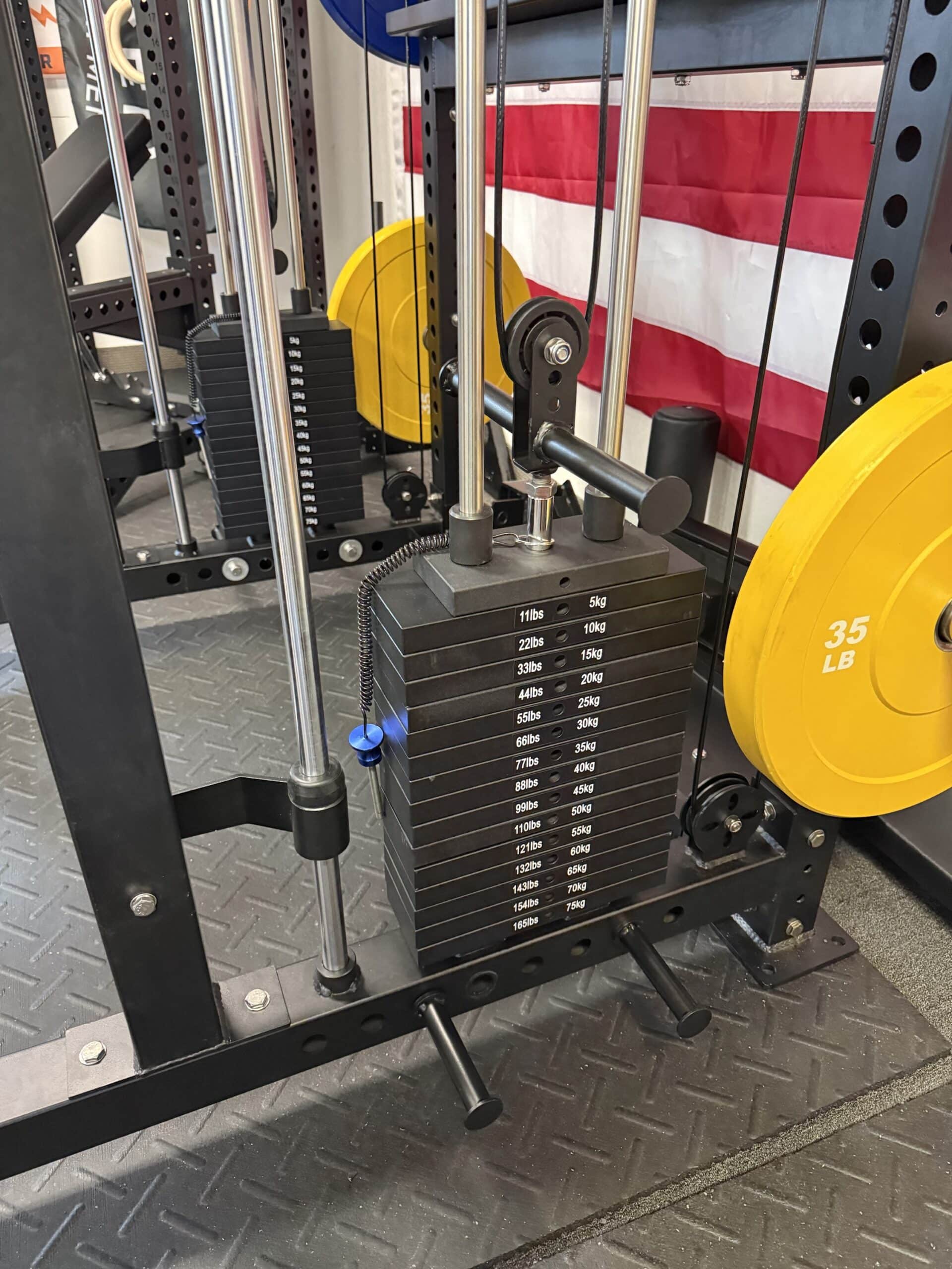 • Dual adjustable pulley system (high & low, functional trainer style) with 170lbs weight stacks