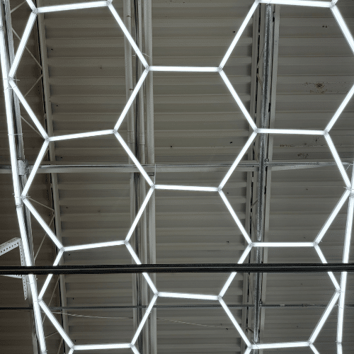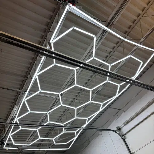 Upgrade your space with our Hexagon LED Lighting Kit. This 14-panel setup covers an 8’ x 16’ area, delivering powerful, energy-efficient illumination with a striking modern design. Ideal for home gyms, garage ceilings, studios, and showrooms looking for a high-impact lighting solution.