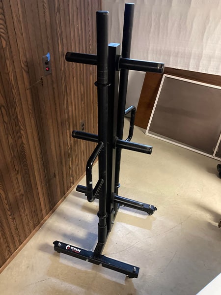 This plate tree is rated for 880lbs and has wheels on the bottom to make it mobile. It also has two barbell holders to fit olympic barbells in